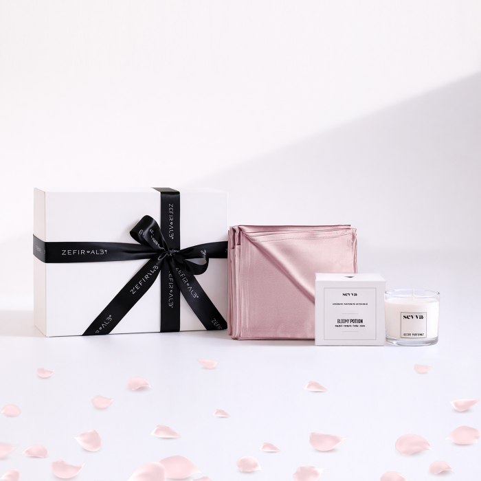 Setul include o față de pernă din mătase Mulberry 6A (50×60 cm), o eșarfă carré din mătase (53×53 cm), o lumânare parfumată Sevva Intense Chocolate, ambalaj de cadou și felicitare.